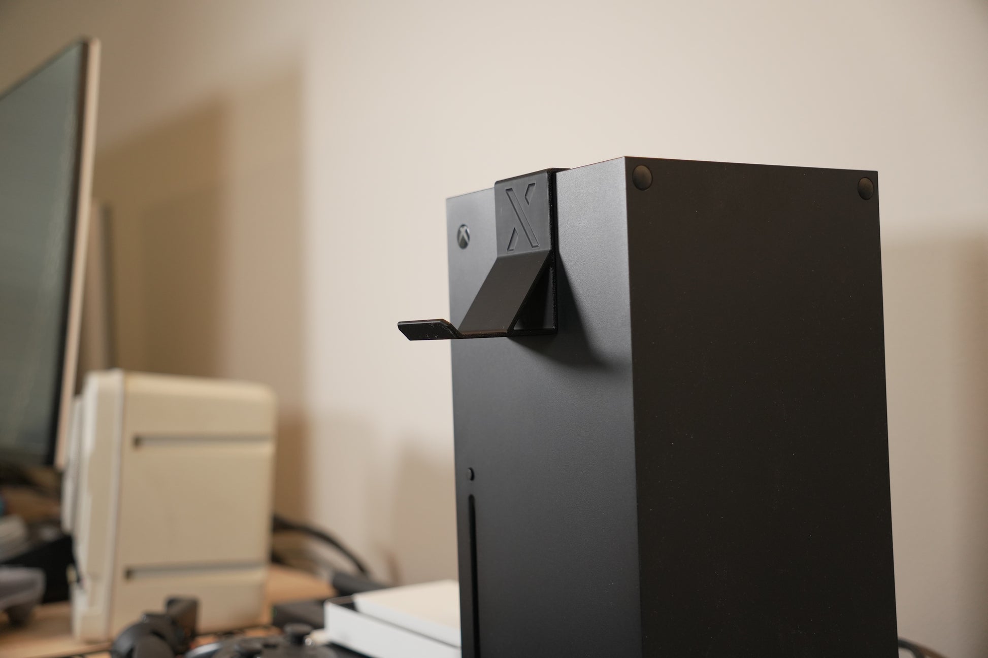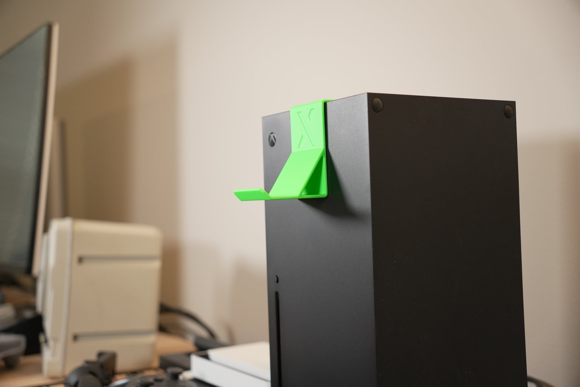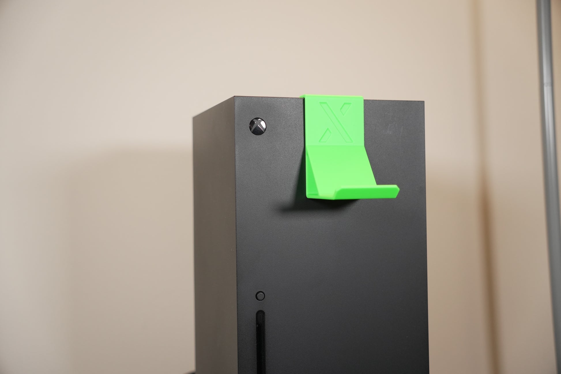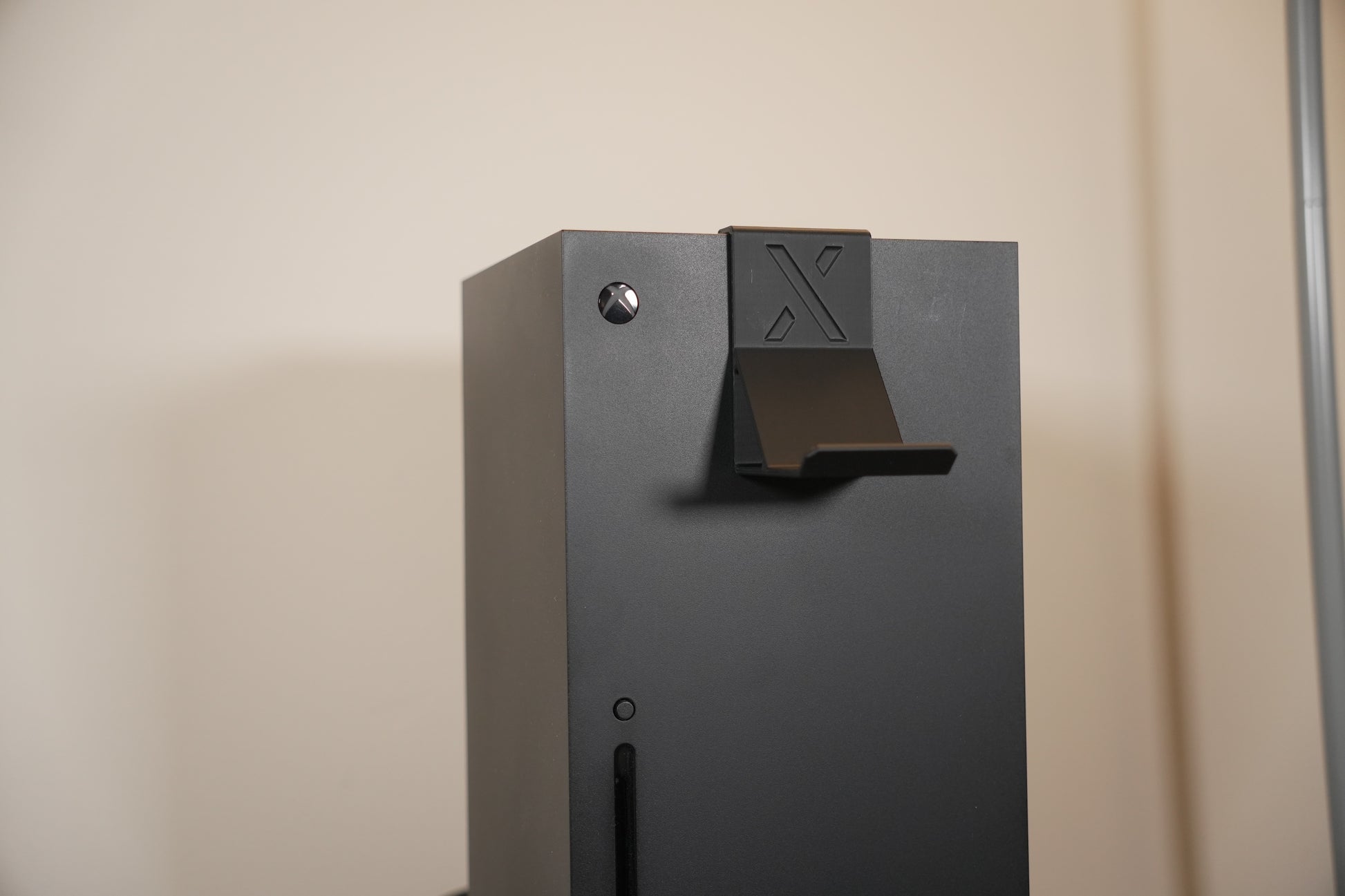 Xbox Series X Controller Hanger. Can also hang headsets and other accessories. Attaches to the top of the Series X fan grill.