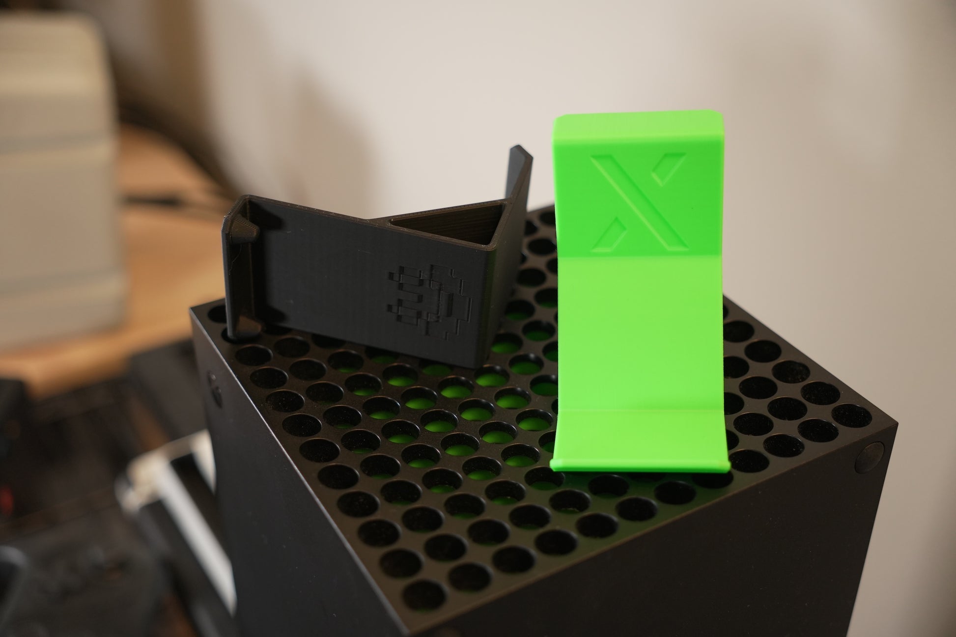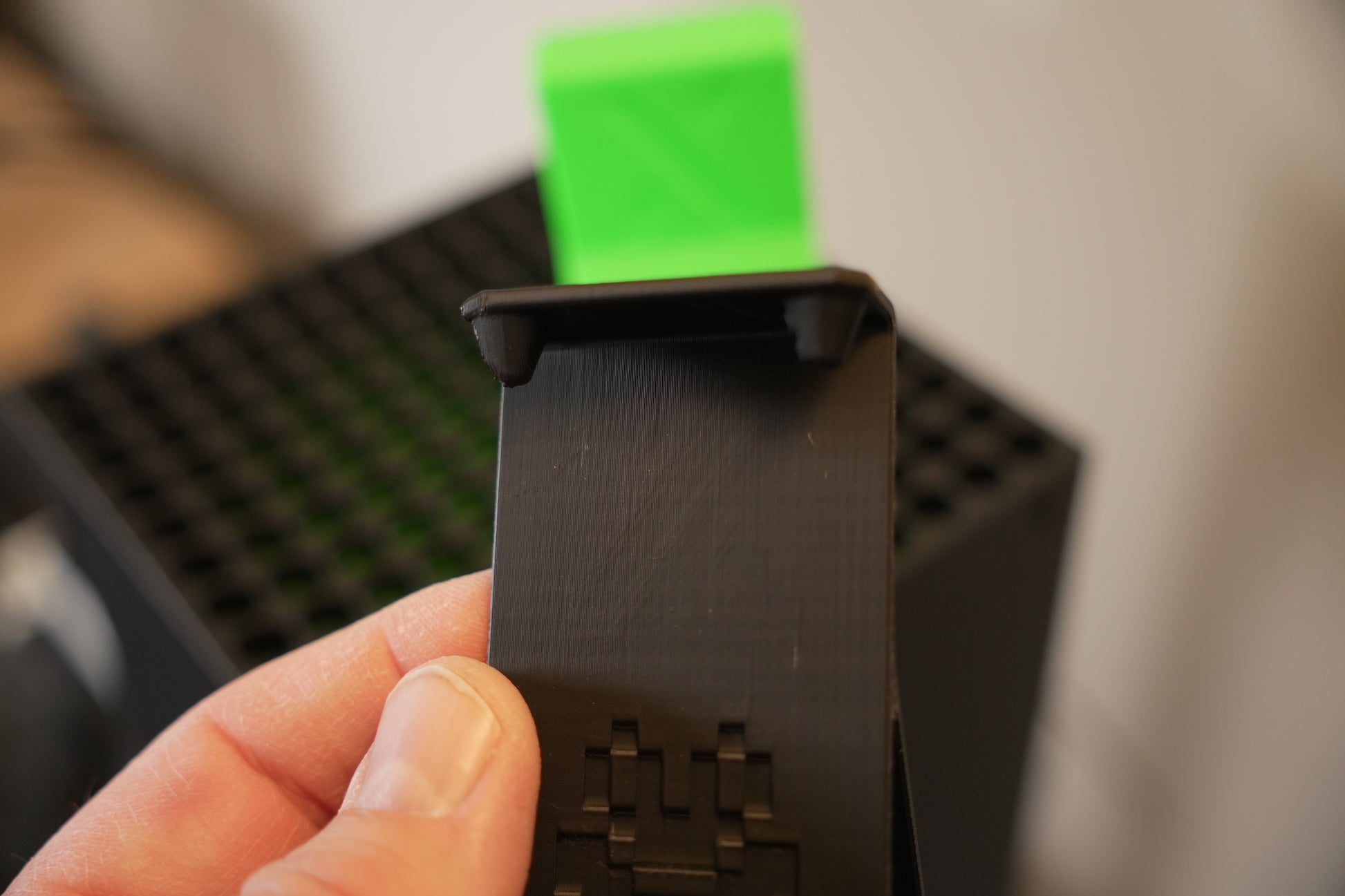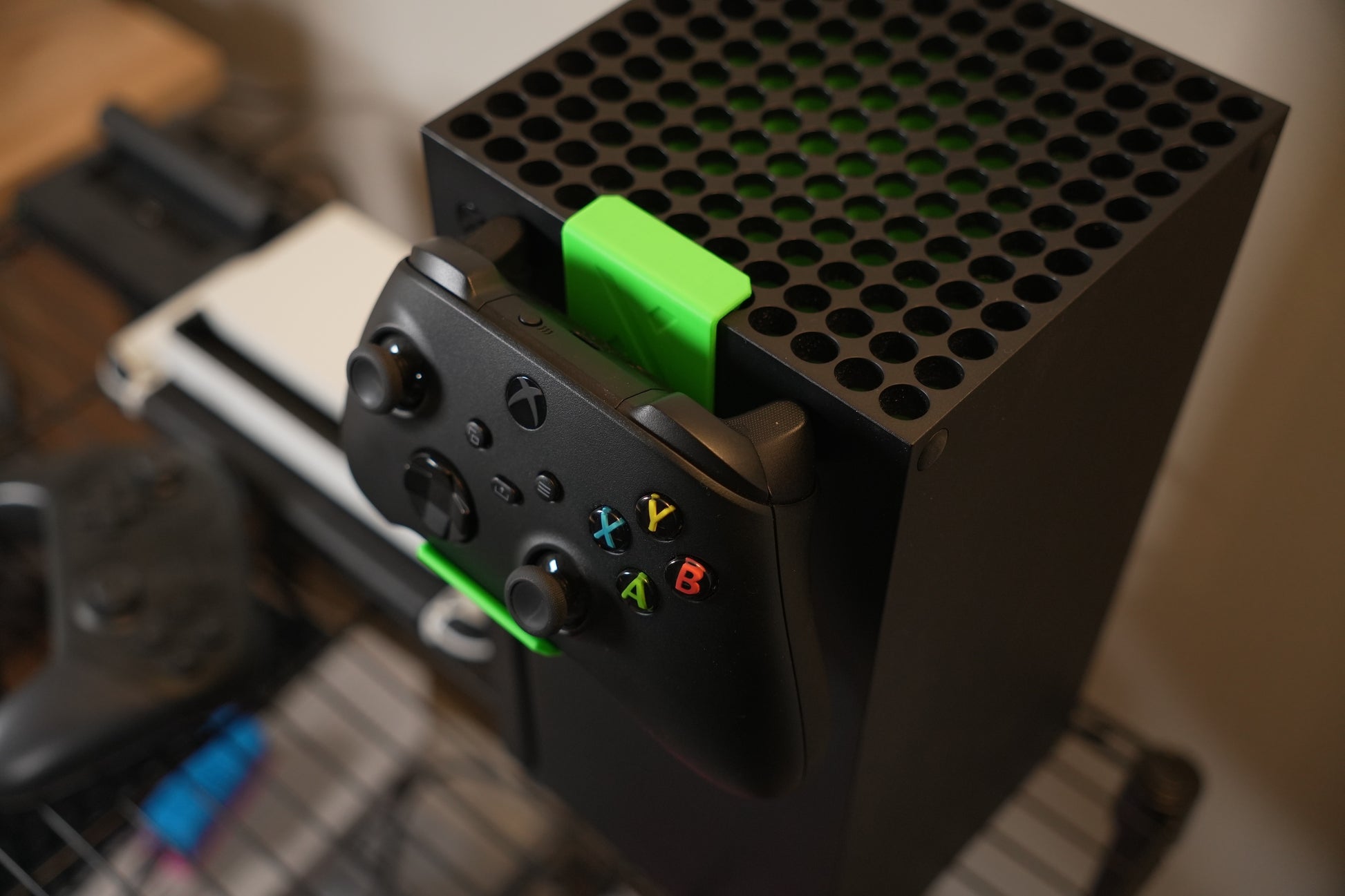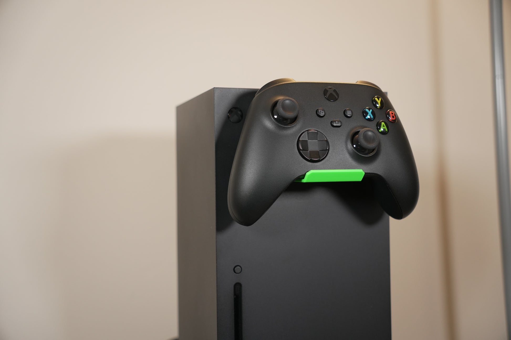 Xbox Series X Controller Hanger. Can also hang headsets and other accessories. Attaches to the top of the Series X fan grill.